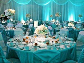 Оформление зала поможет создать праздничную обстановку. Не нужно даже ломать голову, на каком из стиле остановить свой выбор – сделайте цветную свадьбу, главным оттенком которой станет бирюзовый. Можно даже посвятить ему все торжество – включить бирюзовые элементы в наряды «молодых» и гостей, украшение автомобилей, заказать букет невесты и торт в бирюзовой гамме и так далее.