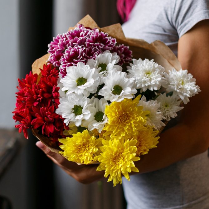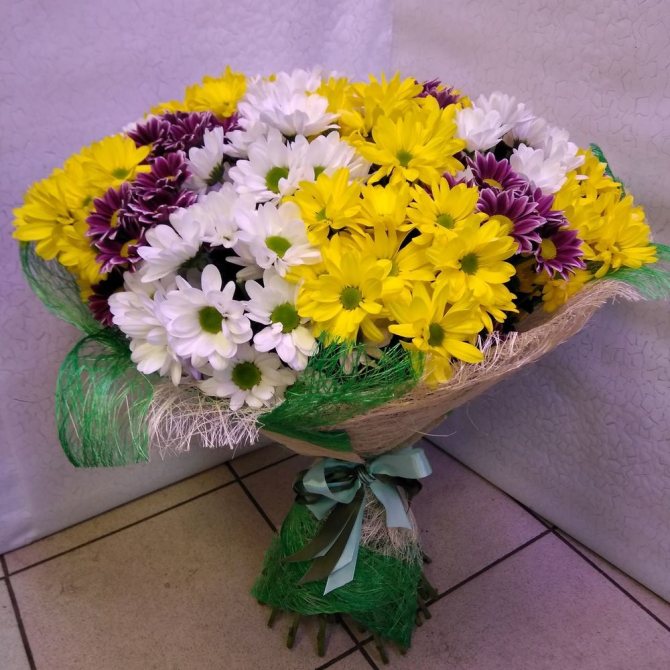 - Букет из хризантем разного цвета. Оформить пышную композицию можно красивой упаковкой вроде сизаля.