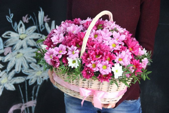 - Корзина с хризантемами. Еще один отличный вариант подачи цветов. Благодаря своей универсальности хризантемы могут быть одинаково прекрасны как в большой корзине, так и в маленьком лукошке;