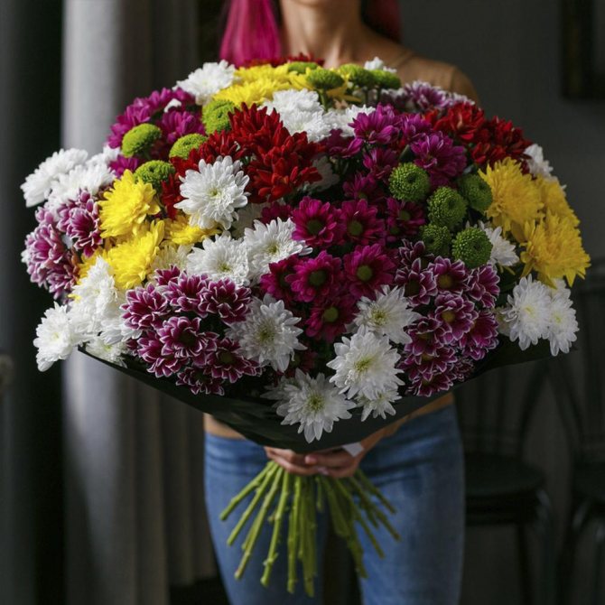 - Разноцветный букет из кустовых хризантем.