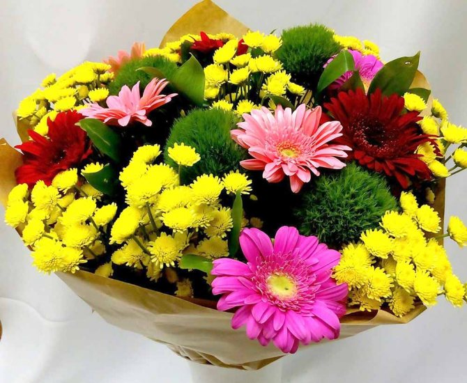 - Букет из 4 видов хризантем в коричневом пергаменте. Не менее эффектно такая композиция будет смотреться в крафт-бумаге;