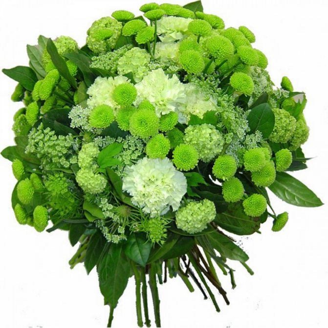 - Букет из зеленой хризантемы с гвоздиками;