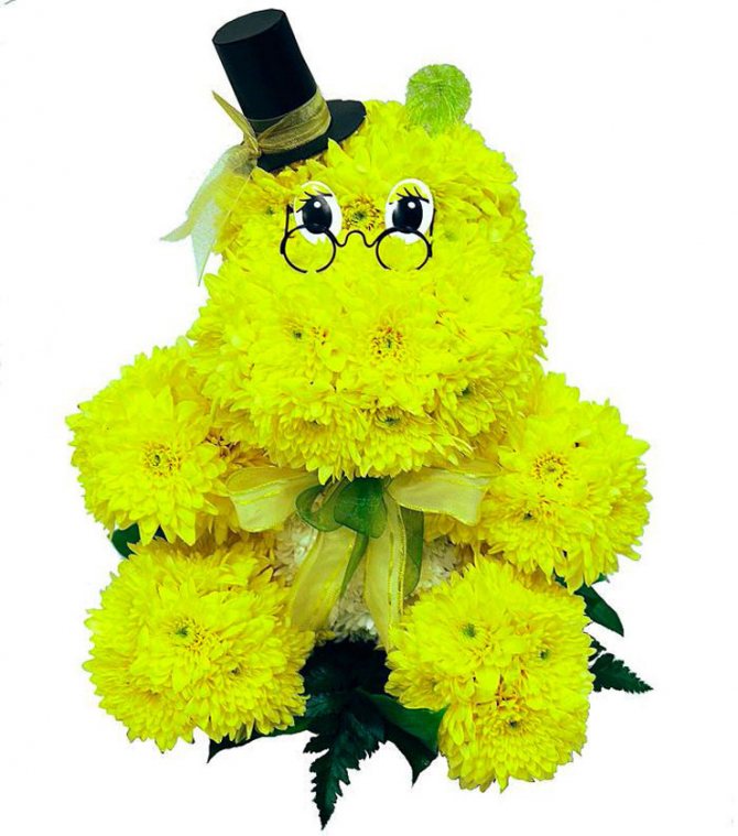 - Игрушка из хризантем. Мишки, зайчики, и даже вот такой бегемот однозначной вызовут улыбку на лице учителя;