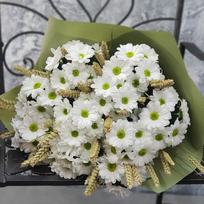 - Хризантемы с колосьями. День учителя, 1 сентября приходится на то время, когда созревают колосья. Почему бы их не использовать в букете? Вместо злакового дополнения можно применить сухоцветы;