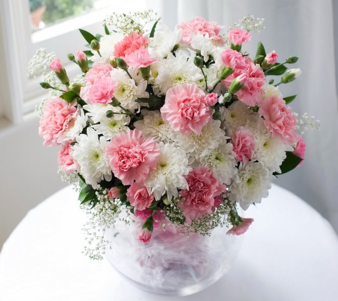 - Гвоздика в сочетании с хризантемой получается очень нежной. Букет словно обретает новое обличие. Обычно мы привыкли видеть красные гвоздики, которые возлагают к монументам, но, на самом деле, у этого цветка много оттенков и разновидностей. Как и хризантема, он может расти в объемных кустах, быть мелким и крупным сортом;