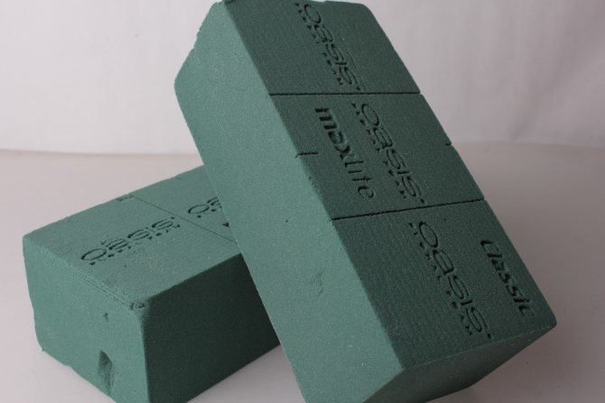 - Оазис. Представляет собой сухой кирпич или, еще его называют, флористической губкой. Продается во всех магазинах для творчества;