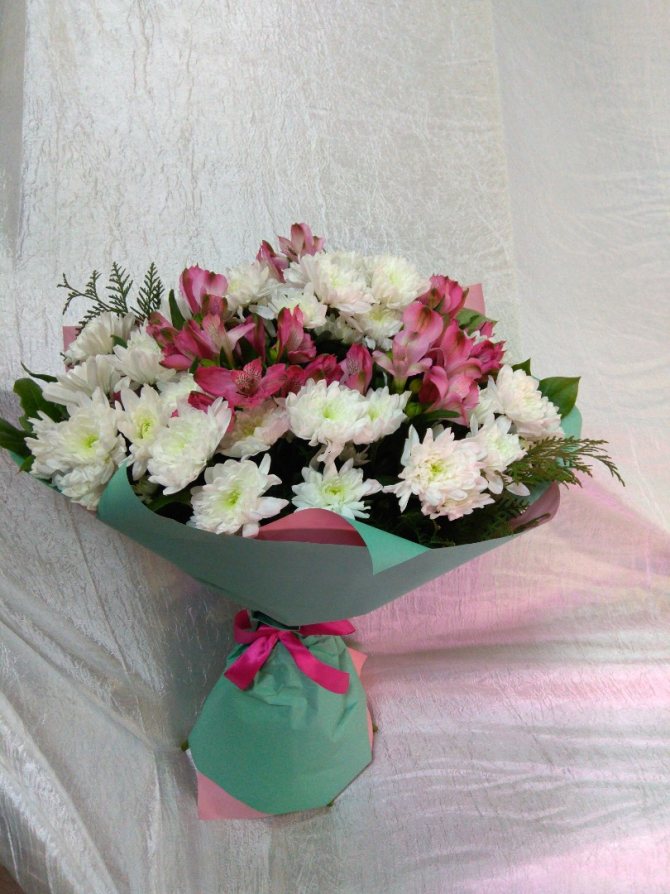 - Хризантемы и альстромерии. Желательно собирать композицию из разных цветочных оттенков. Эти цветы дополнят друга друга;