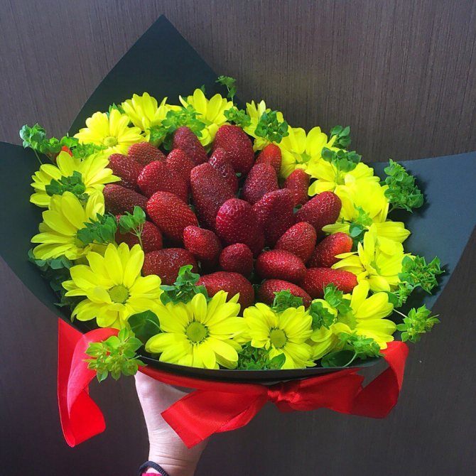 - Букет из хризантем и клубники. Красивый и в то же время вкусный презент.