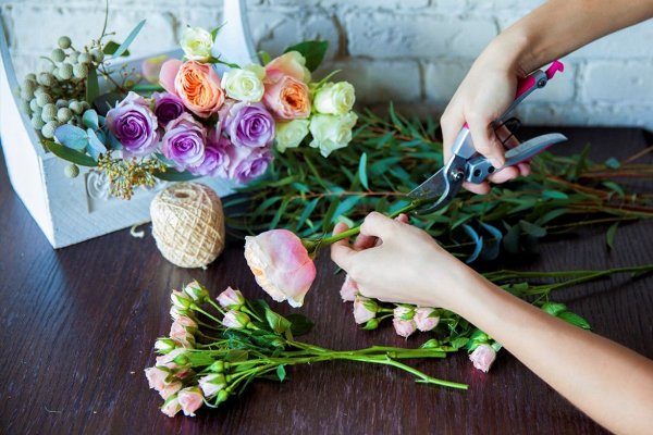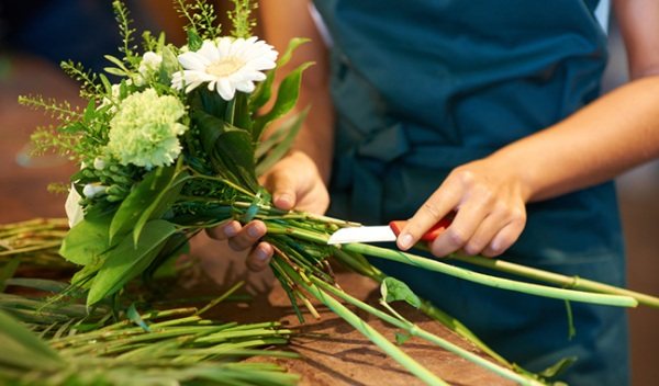 - Собранный букет повторно крепко фиксируется лентой, проволокой или жгутом, после чего лишние концы обрезаются секатором. После этого ножом обязательно подрезаются наискось стебли, иначе букет не будет пить воду и не простоит долго.