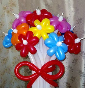 Все они сделанны исключительно из разноцветных воздушных шариков. Особенность каждого букета – его состав и оформление. Цветочки крепят на подставку или связывают лентой, дополняют композицию игрушкой или надувными фигурками.