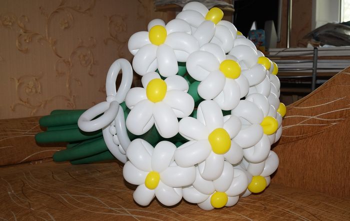 Например, красиво смотрится букет для невесты, шары для которого скрученных в виде разноцветных ромашек.