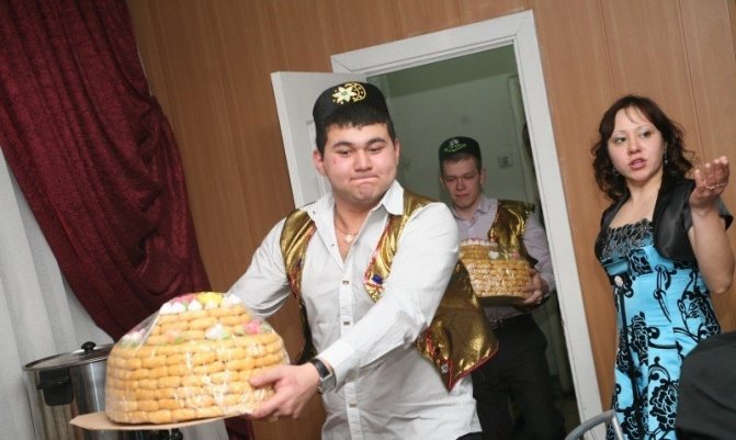 Что касается застолья по поводу никаха, то по татарским традициям семья жениха привозит на праздник: