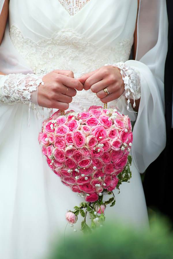 Розовые цветы символизируют молодость и их, как правило, выбирают молодые пары. Невеста выглядит хрупкой, нежной. Платье может быть любого оттенка, также, как и костюм жениха – розовые цветы прекрасно сочетаются с любыми нарядами.