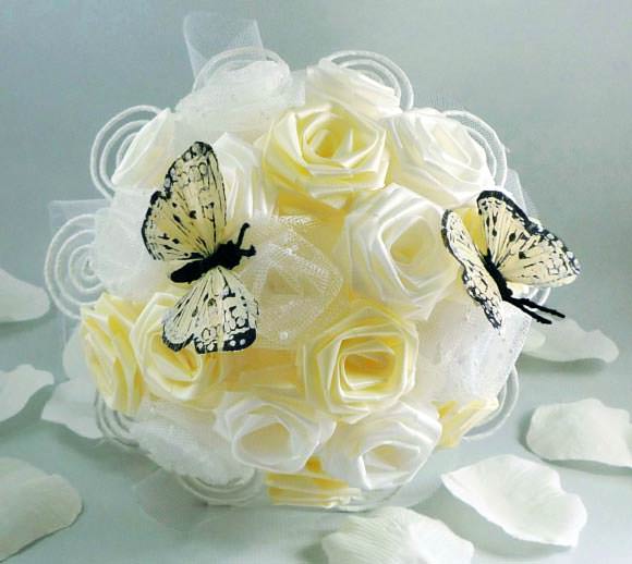 Дополнительными элементами украшения могут стать бусы, банты, броши. Их аккуратно приклеивают, следя чтобы клей не проступил наружу. Цвет декоративных элементов должен сочетаться с цветом розочек. Не гонитесь за слишком большим и пышным букетом. Помните, что невесте предстоит его долго держать в руках, и она может устать.