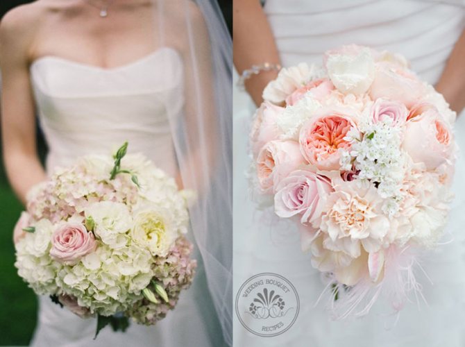 - Композиции из роз и гортензий. Плотный круглый букет из гортензии и пионовидной розы – одно из лучших дополнений к наряду невесты. Такая аранжировка выглядит очень изящно и аристократично. Пушистые соцветия гортензии, состоящие из множества небольших цветков, служат выгодным фоном для царственных роз. В зависимости от стилистики свадебного наряда, из этих цветов можно составить как монохромные, так и разноцветные композиции. Аранжировка из белых роз и гортензий – воплощение чистоты и нежности. Она не нуждается в обилии дополнительного декора. Чтобы подчеркнуть ее торжественность, достаточно будет белой ленты, соединяющей стебли цветов. На фоне голубых соцветий гортензии будут красиво смотреться белые, кремовые и светло-желтые розы. Не менее эффектно выглядит красный свадебный букет из пионовидных роз, окруженных белыми гортензиями.