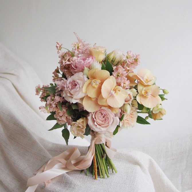 Очевидная, но от этого не менее роскошная, классика — монобукет из роз Остина. Торжественный и чувственный, он украсит образ каждой новобрачной. Придать композиции немного озорной вид помогут веточки астильбы или матиолы — эти цветы разбавят ровную поверхность связки остинок. Тут можно экспериментировать с цветовыми гаммами — все эти три цветка имеют широкую палитру окрасов, что позволяет Вам создать уникальный букет персонально для себя.