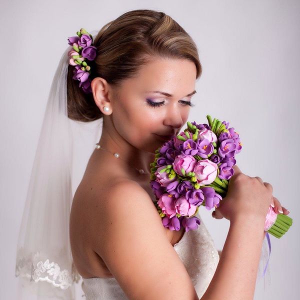 - Если в прическу невесты вплетаются живые цветы, то они должны быть такими же, что и в букете.