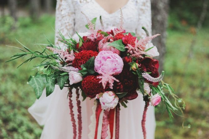 Букет часто дополняют ампельной зеленью и длинными лентами, чтобы придать ему каскадную форму.