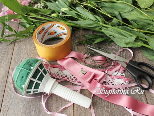 Ручка заготовки обязательно должна быть задекорирована шнуром или лентой. Цвет и фактура декоративных элементов выбираются в соответствии со стилем композиции. Чтобы рука не скользила по ручке, флористы используют сочетание гладких и ворсистых лент.