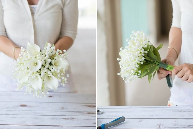 Нежный, маленький букет невесты в белом цвете идеально подходит для весны. Даже если использовать в нём только 2 вида растений: каллы и ландыши, впечатление всё равно будет потрясающим. А какой пьянящий аромат окружит девушку, выбравшую для свадьбы этот оригинальный «дуэт».