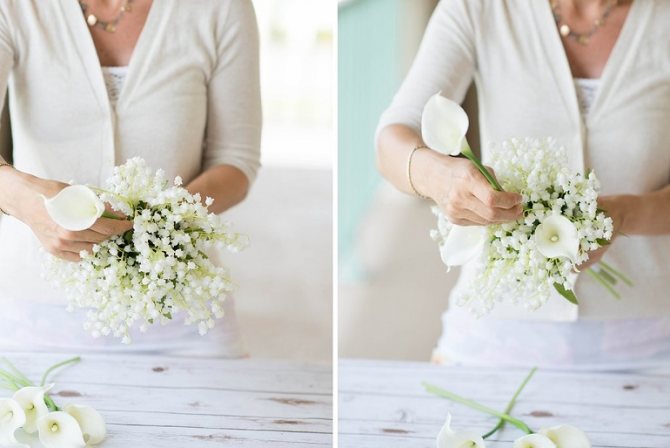 Приступаем к сборке. Начинаем с ландышей, формируя лёгкое, снежно-белое облачко. Для увеличения объёма, укладываем растения по спирали. Между ландышами располагаем акцентные каллы.