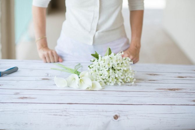 У калл оставляем только цветоносы, ландыши используем прямо с листьями.