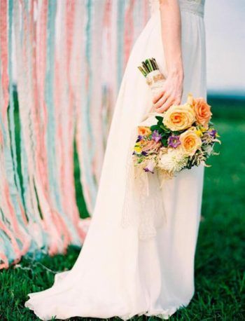 Украсить стоит и сам букет. Нежные цветы кремовых, бежевых или персиковых оттенков дополнят оборки из шелка или кружевного полотна.