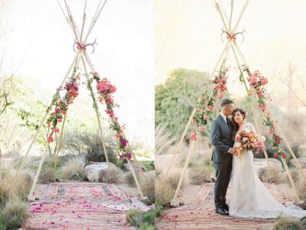 Для украшения церемонии и создания красивых фотографий необходимо установить арку. Вместо использования традиционных цветов, ее можно украсить цветными лентами, гирляндами с перьями и иными предметами, продублированными в разных местах. Очень красиво будут выглядеть китайские бумажные фонарики в цветовых гаммах свадьбы.