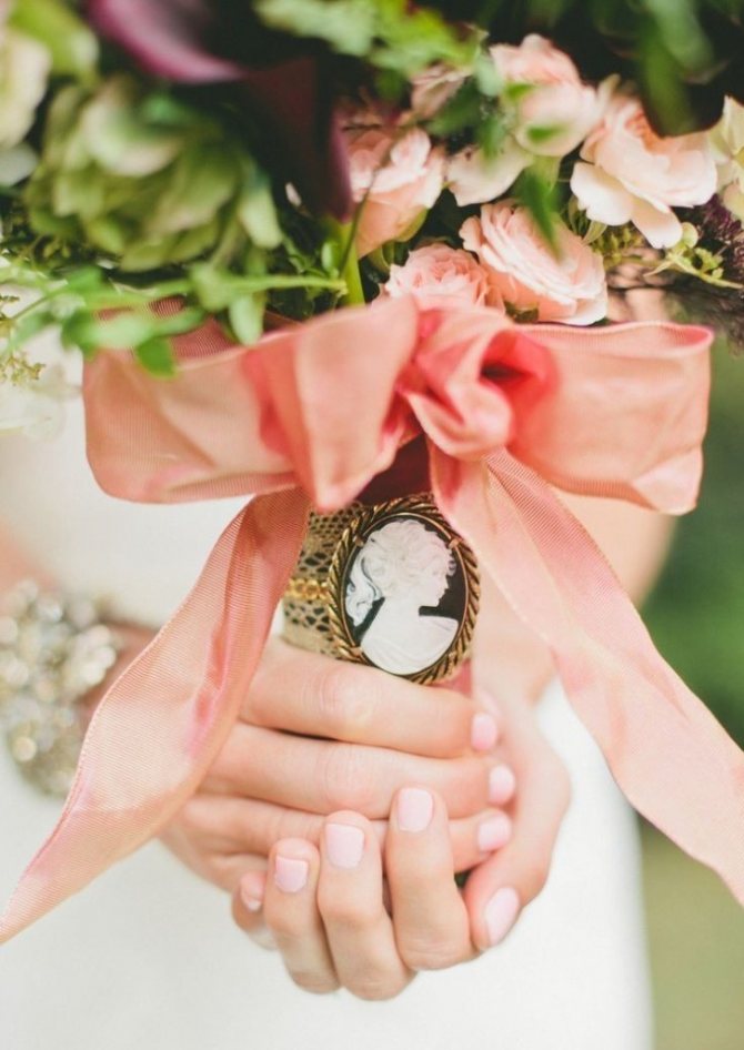 Наиболее подходящими тонами для свадьбы в стиле шебби-шик являются пастельные и пудровые: белый, бежевый, розовый, персиковый, в некоторых случаях оттенок молочного шоколада. Украшением букета, дополняющим аристократический стиль, станет вьющаяся бархатная лента или аккуратная камея.