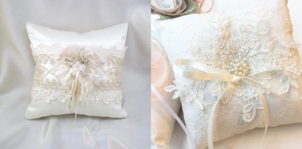 Не стоит отказываться от такого милого свадебного аксессуара, как подушка для колец. В продаже можно найти готовые варианты из светлого атласа, украшенные кружевом или вышивкой. А для тех, кто увлекается рукоделием, не составит сложности создать свой неповторимый авторский вариант. За основу можно взять любую готовую подушечку нужного размера, обтянуть ее подходящей тканью и украсить бахромой, кружевной каймой или вышивкой.