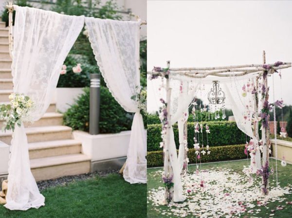 Арки, в основном, представляют собой импровизированные легкие конструкции. Наиболее распространенный вариант – П-образная основа из деревянных планок, украшенная текстильным декором. Это может быть отрез ткани, красиво задрапированный на верхней перекладине, «занавес» из лент или нитей, украшенных бусинами. Красиво смотрятся и кованые арки в стиле бохо. Ажурные переплетения металла будут гармонично сочетаться с флористическим декором из цветов и трав.