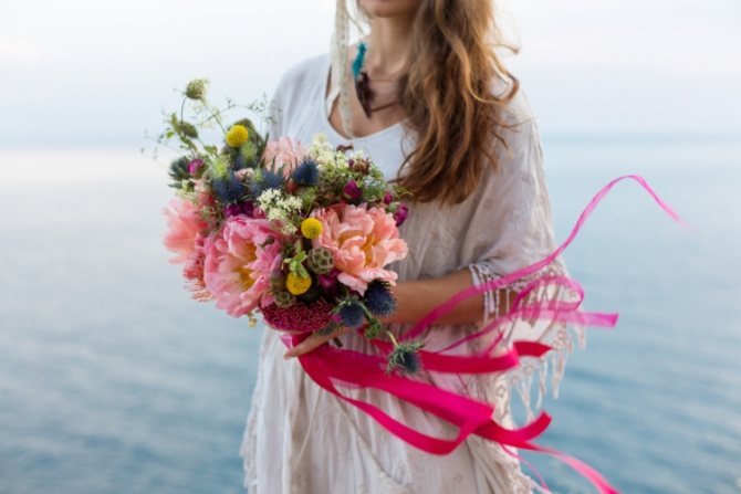 Ножка букета и сама композиция декорируются самыми разнообразными вариантами – кожаные шнурки, ленты, птичьи перья, тесьма, крупные декоративные элементы в этническом стиле. Все, что присуще такому разнообразному богемному стилю бохо – будет уместным.