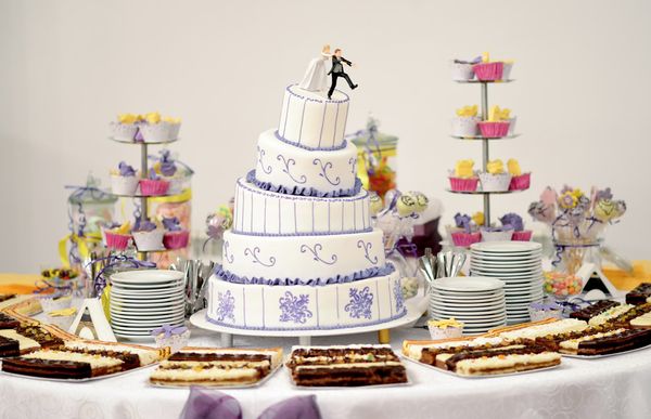 Свадебный торт изготавливается в нежно-сиреневых тонах с добавлением ярких цветов — кондитерских, либо живых.