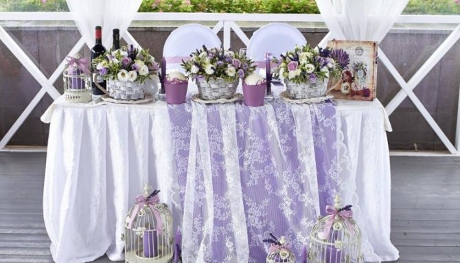 Белый тон делайте основным, и на его фоне дополняйте общий дизайн, можно воланами из сиреневого фатина или цветочными композициями в выбранной тематике. В лавандовом стиле это выглядит так.