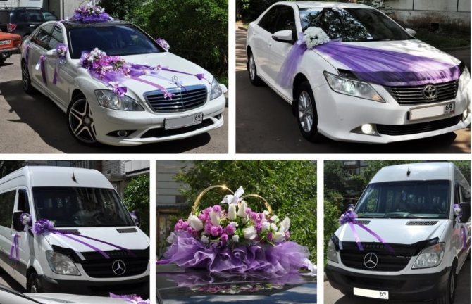Украшения на машину могут быть достаточно разнообразными. Смело декорируйте автомобили лентами, цветами, шарами. Если на свадьбе в качестве основного декора используются живые растения, то при бюджетном варианте достаточно небольших букетиков на ручки машин.