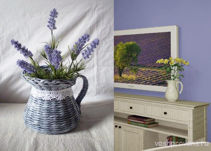Такая композиция должна быть выдержана в спокойных, неярких цветах. При ее создании можно использовать пастельные оттенки: лавандовый, небесно-голубой, светло-бежевый, оливковый. Для создания прованской атмосферы можно заменить атласную ленту бечевкой.