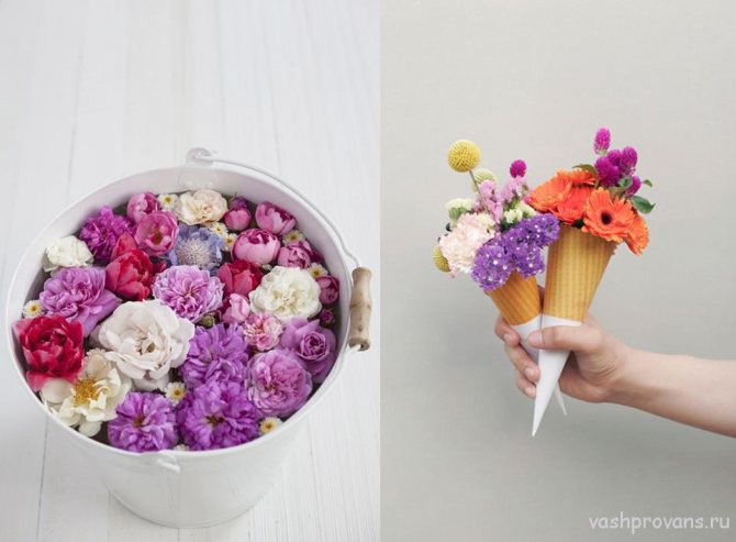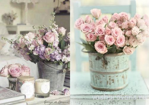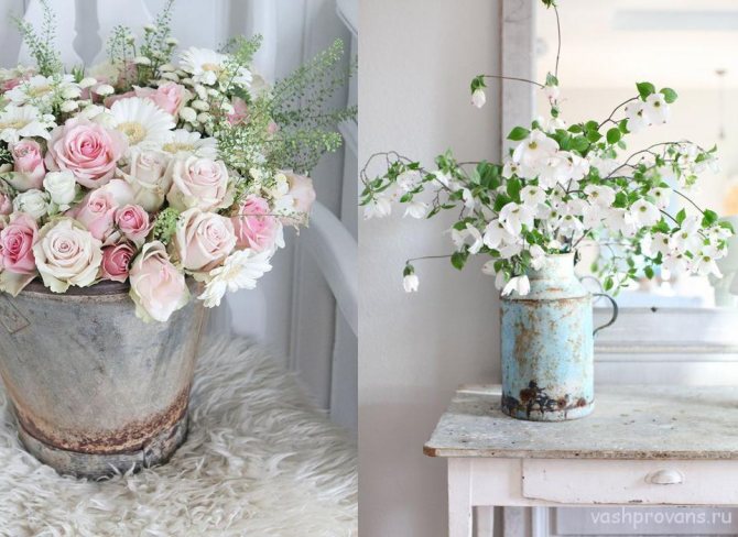 Естественность, присущая стилю, находит свое отражение и в выборе посуды под цветочные букеты. Это могут быть не только вазы в классическом понимании. Цветы можно поместить практически в любой сосуд. Для кухни можно использовать кувшин в пастельных тонах с размытым рисунком. Для террасы или веранды подойдут цинковые ведра или лейки, которые покрашены в белый или другой светлый оттенок. И даже башмаки и глиняные горшки на садовой аллее. В этом и есть шарм простоты и естественности, когда отметается все вычурное и искусственное. Цветы, помещенные в то, что как бы находилось под рукой, от маленьких бутылочек до ведер.