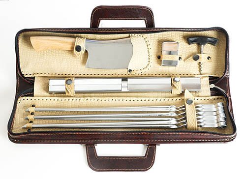 - Охотнику – набор шампуров в кейсе, охотничьи статуэтки, мини-коптильня, мини-бар, фляжка с рюмками, мультитул, палатка, изотермическая сумка.