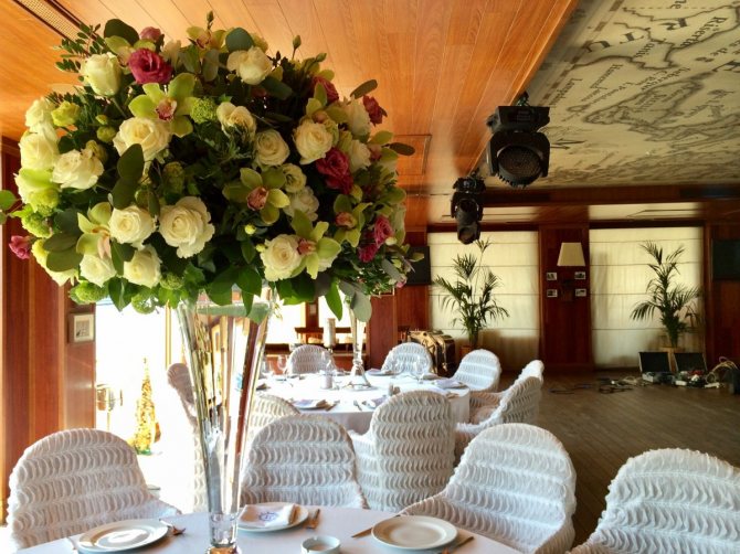 То, как вы будете декорировать торжественный зал, лучше продумать заранее. Самым нарядным, конечно, является украшение живыми цветами.