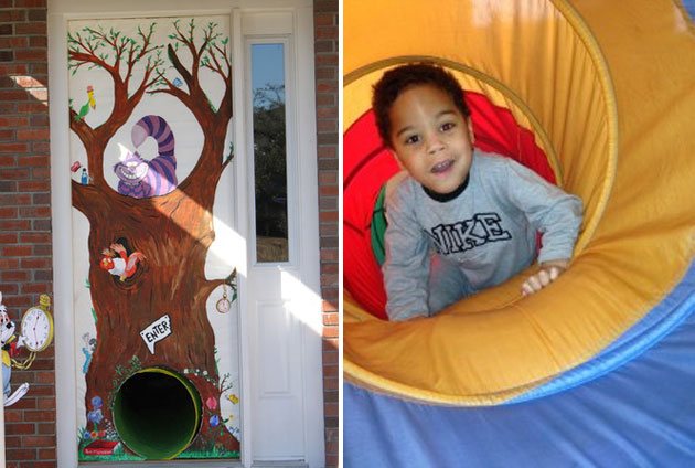 Но для того, чтобы веселиться на день рождение в Стране чудес, надо туда еще попасть. Чтобы гостям было понятно сразу, куда они пришли, можно предложить проход через нору. Например, повесить в проеме двери клеенку или ткань, разукрасить ее и сделать в ней дырку. А если у вас есть еще и игровой тоннель, то смело подставляйте его к дырке, пролезая через него младшие гости будут в восторге, а старшие слегка разомнутся.