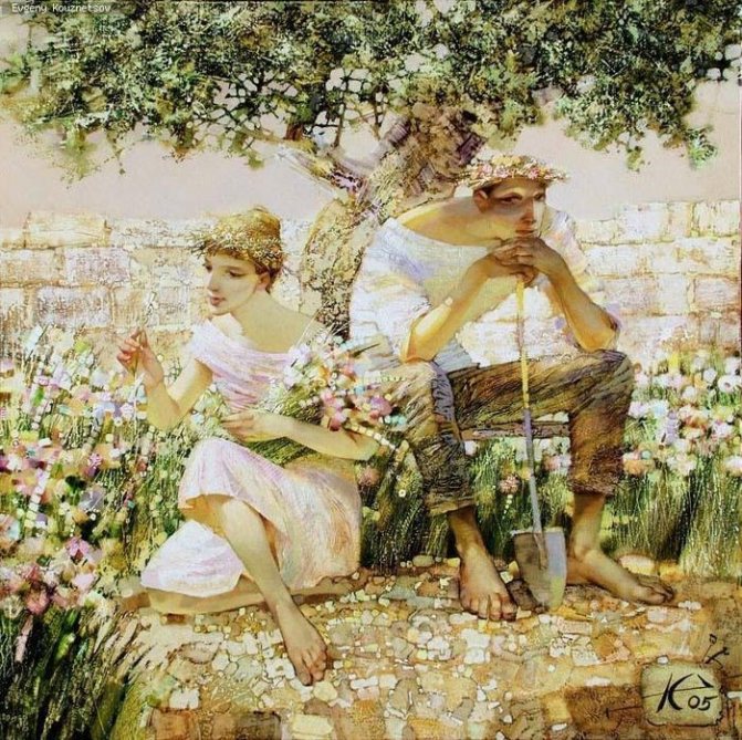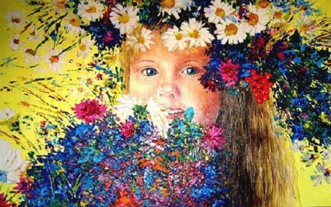 Анатолий Медко. «Нарву цветов и подарю букет…». 2009 г. В тёплые летние месяцы поля, холмы и леса благоухают, украшенные цветочной мозаикой, а девушки плетут из полевых цветов венки. С древних времен юные прелестницы умножали свою красоту цветами, ведь они будто созданы друг для друга. И что может украсить молодую девушку лучше, чем сплетённый из множества полевых цветов венок? Девушки любовались цветами и плели из них венки, а восхищенные художники рисовали их портреты. И портреты эти — сплошное очарование. Лето, девушки и цветы…