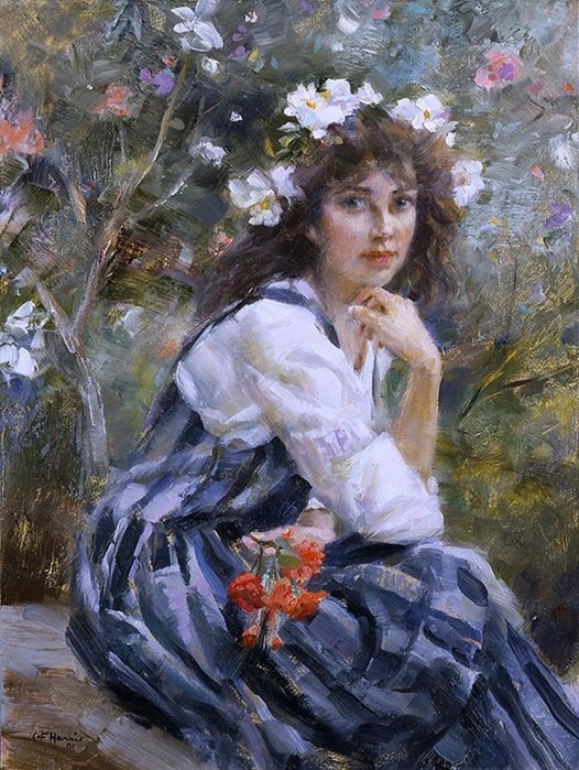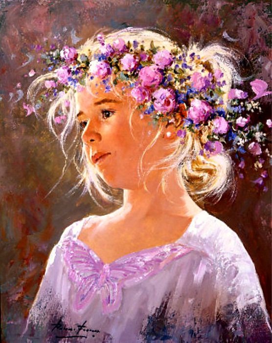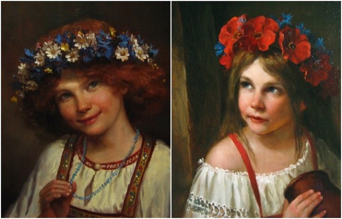 Автор неизвестен. Первая любовь (лаванда) Юные красотки в прелестных веночках Венок из полевых цветов – одно из самых простых, доступных, и в то же время изысканных украшений для головы. А в живописи цветочные венки — очень красивая и трогательная тема, которая уносит нас в далекое детство. Портреты юных созданий в цветочных венках необыкновенно романтичны. Много таких работ можно встретить у русских художников.