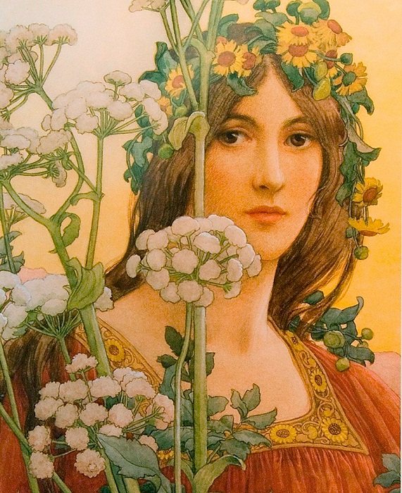 Художник Альфонс Муха Но плели венки не только для украшения или забавы. С давних пор их использовали и в качестве оберегов от нечистой силы, сглаза, они являлись обязательными атрибутам языческих обрядов у славянских народов. Под вечер в Троицу и на Ивана Купалу незамужние девушки сплетенные венки бросали в реку, приговаривая: «Плыви мой венок на тот бережок, кто поймает мой венок – тот будет женишок».