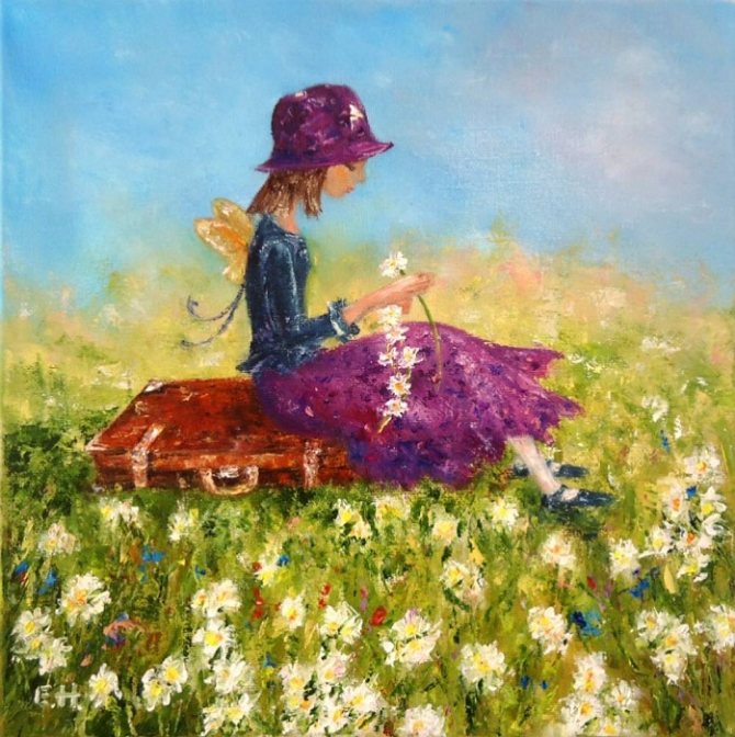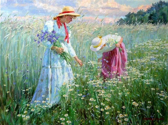Художник Марина Федорова. На лугу Самый известный в России цветок, считающийся символом любви. Не зря на нем все гадают — «любит-не любит». Ромашка также олицетворяет юность, доброту, нежность.