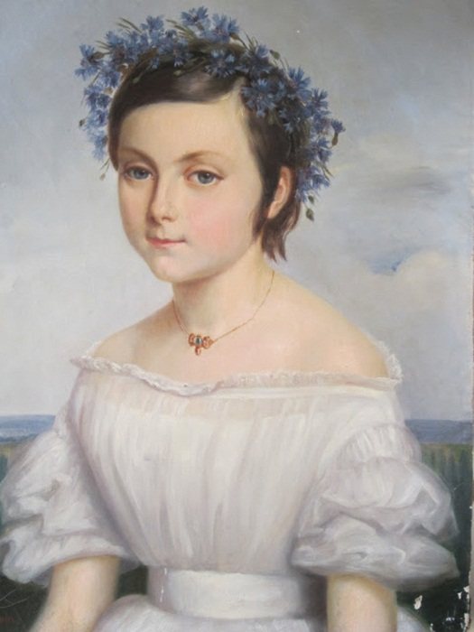 Bathilde Goblain. Portrait de jeune fille a la couronne de bleuets.