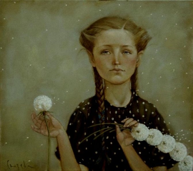 Наталья Сюзева. Венок из одуванчиков 2011 г. Венок из одуванчиков! Мне просто делать нечего. Стою такая умная И пух летит на плечи мне. Стою такая глупая. Пытаюсь с ветром справиться. Хочу тебе — серьезному Хоть чуточку понравиться. Венок из одуванчиков! Нелепая безделица. А я стою — счастливая. Аж мне самой не верится. Вита Савицкая, 2009 Порой и мне случалось быть предметом Немого обожанья и забот. Младенчество. Лужайка ранним летом. И девочка сидит, венки плетёт. И, возложив корону золотую На стриженую голову мою, Вся светится. А я не протестую. Я сам себя кумиром сознаю. И, радуясь сияющему взгляду, На девочку гляжу, на облака, Послушно исполняю роль царька И ощущаю тяжесть, и прохладу, И свежесть, и торжественность венка. Валентин Берестов 1981 г.