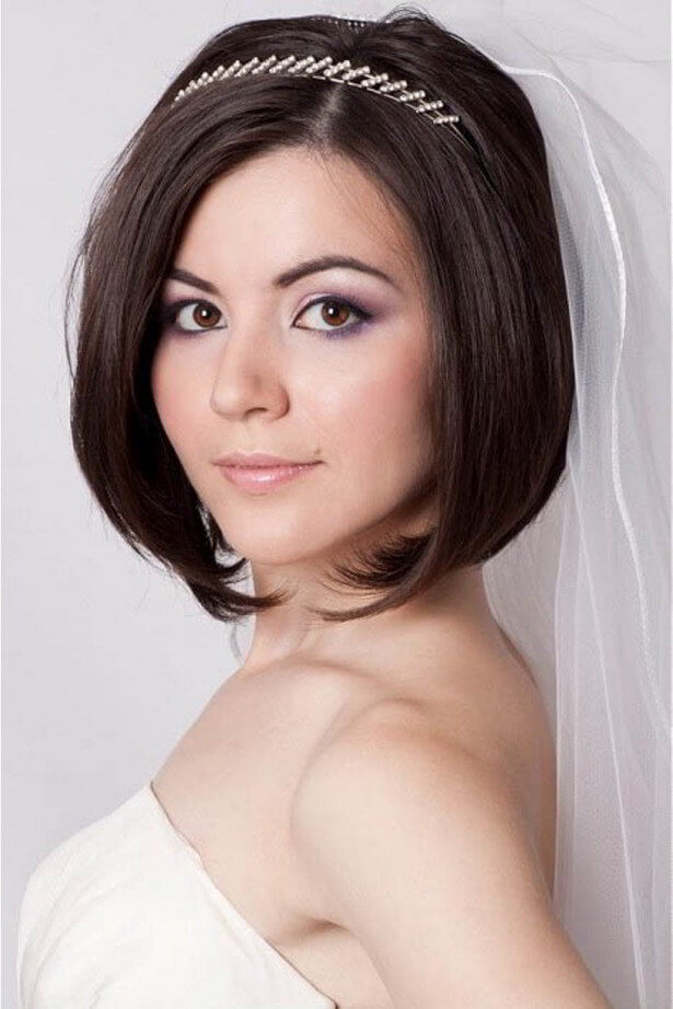 Обладательницам короткой длины (до 10 см) весьма тяжело создать необычный образ. Если ваша длина как на фото ниже, то вы можете уложить волосы назад, прикрепив на затылок фату. Диадему можно красиво расположить возле макушки.