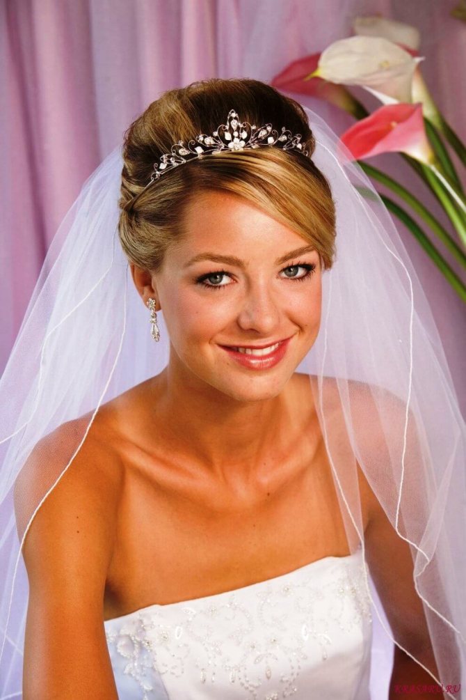 - Круглолицым невестам стоит сделать высокую прическу с удлиненной вверх диадемой – такое сочетание визуально вытянет лицо;