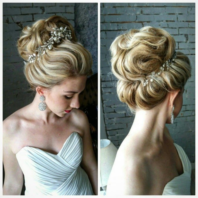 Начес или собранные наверху завитые локоны – наиболее подходящий вариант для изысканного наряда в классическом стиле. Выглядит укладка сдержанно, но за счет диадемы свадебный образ становится эксклюзивным. Если вы выбираете скромную тиару, к ней требуется обязательное дополнение в качестве яркого макияжа и крупных сережек.