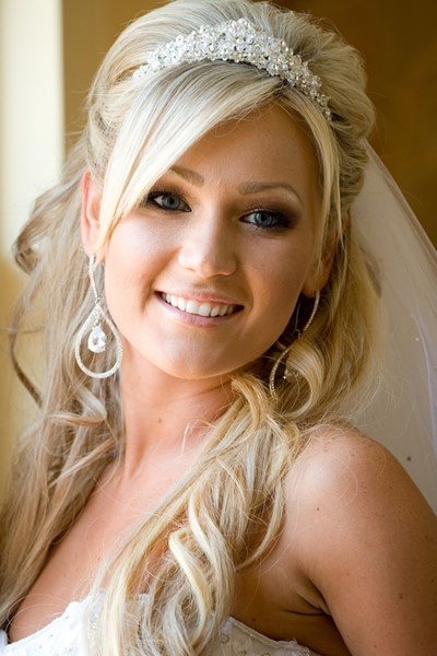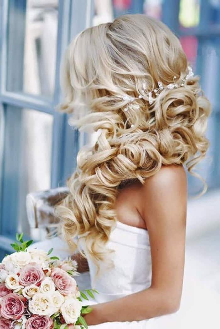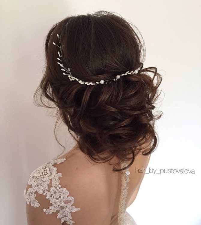 Очень эффектно выглядит укладка кудрявых волос, собранных в виде ниспадающего водопада, украшенная диадемой с россыпью камней. Такая невеста будет подобна богине, сошедшей с Олимпа, и произведет неизгладимое впечатление на гостей торжества.